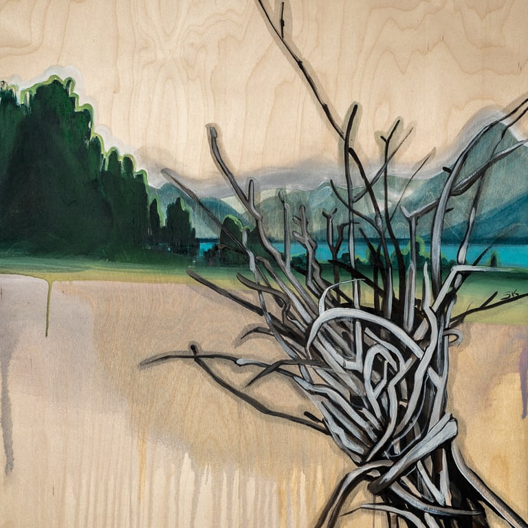 I have always drawn, and later studied photography, video, and art history. In 2009, I moved to the Kootenay region and began painting. What began as a short stay became long-term, and I developed a full-time practice rooted in close observation of the landscape, its ecosystems and seasons.